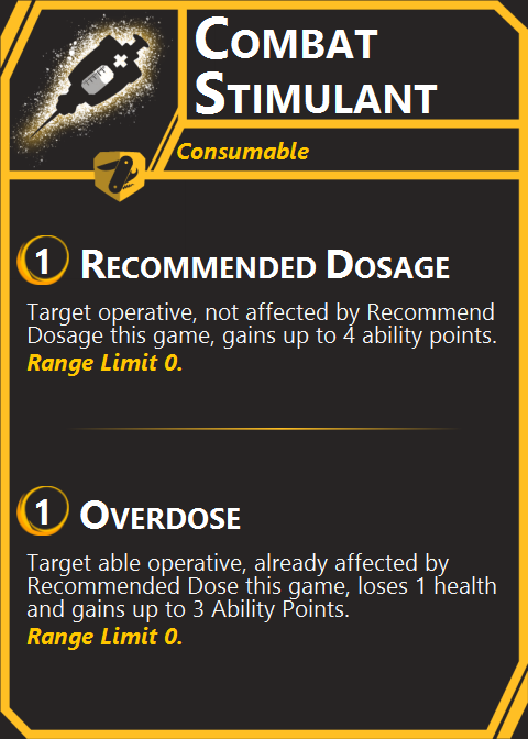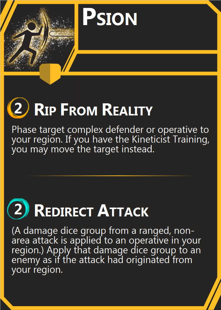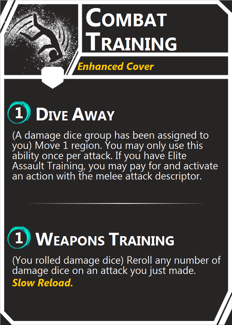 Additionally, each operative is outfitted with a selection of trainings, weapons, and accessories. This resulting combination of cards describes the actions each operative can take.