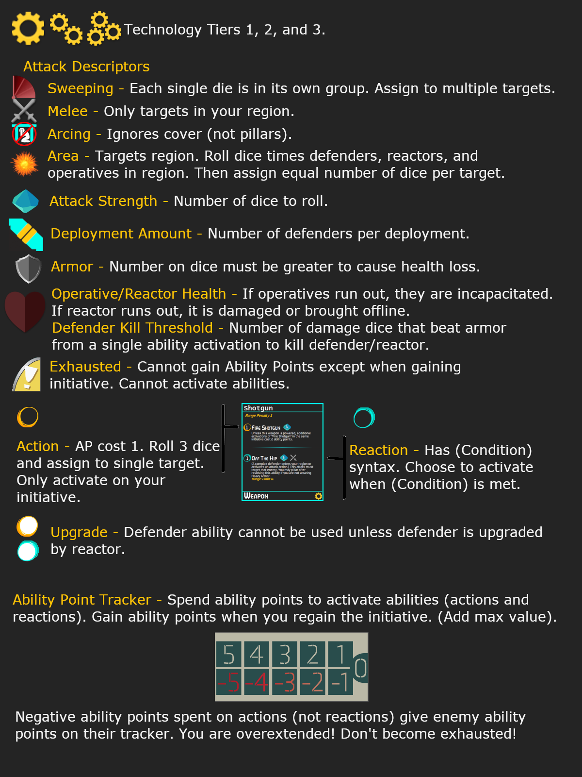 As the game progresses, the complex manager stages more powerful defenders by investing precious reactor charges. Once staged, those defenders can be deployed in order to halt the operatives' progress. Operatives advance as well by locating two special regions called tech regions. While in these regions, operatives can unlock new abilities that will allow them to compete with the ever strengthening complex forces.